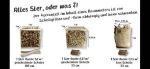 Unverbindliche Faustregel: 1 Ster (m3) Scheit- bzw. Rundholz = ca. 0,85 Raum-meter (m3) Stückholz.